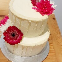 A bright and vibrant cake with a delicious white chocolate buttercream. Topped woth a vanilla/white chocolate cheese cream frosting or buttercream. Sprinkled with a red velvet crumb.